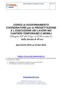 4 Marzo 2026 Corso di AGGIORNAMENTO per Coordinatore per la progettazione e per l’esecuzione dei lavori (40 ore). Marzo – aprile 2026. -